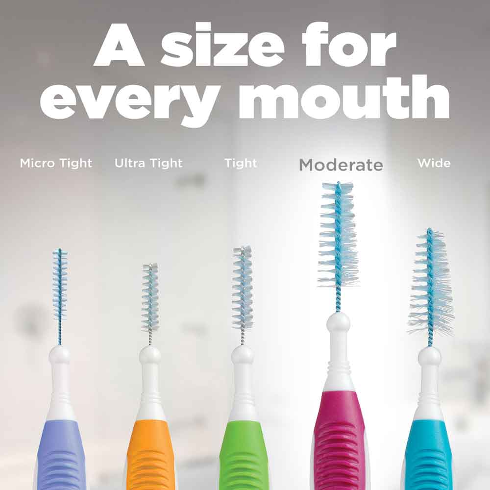 GUM Proxabrush Go-Betweens Interdental Brushes, Moderate are manufactured with triangular bristles which are 25% more effective at removing dental plaque from between teeth than conventional round bristles. The nylon-coated wires are designed for comfortable cleaning around dental appliances, fixtures, crowns, implants, orthodontics, and other hard-to-reach places without scratching or causing galvanic shock. Coated with a patented antibacterial agent for continuous protection throughout the 10-day recommended usage period. Protective travel caps included to put in your pocket, purse or car for on-the-go usage. Specially crafted nonslip rubber handle for comfortable and precise grip with a bendable neck that allows for maneuverability towards the back of the mouth and hard-to-reach areas.