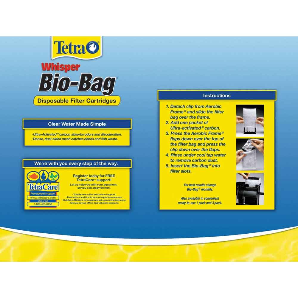 The dense, dual-sided mesh catches debris and fish waste. Ultra-Activated® carbon absorbs s. Use these replacement filter cartridges in your Tetra water filter. each package is color-coded to make it simple to remember which size to purchase. These replacement filters are easy to assemble and easy to replace. Clear water made simple. Replace a clogged Bio-Bag filter cartridge when there is reduced water flow out of the filter. For best results, change your filter cartridge monthly or sooner if needed. Size large. Choose the medium size filter cartridge to fit the Tetra Whisper PF10 Power Filter, 10i Internal Filter, and Reptofilter® 90 GPH; and choose the large cartridge to fit the Tetra Whisper 20, 30, 40, and 60 Power Filters and 20i and 40i Internal Filters. Since 1951, Tetra has developed the world’s most comprehensive body of fish food knowledge, and fishkeeping enthusiasts have looked to the brand for products and solutions that add ease and beauty to their homes.